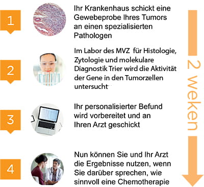 Der Test wird an einer kleinen Gewebeprobe durchgeführt, die bereits während der Biopsie oder der Operation entnommen wurde – es ist kein zusätzlicher Eingriff notwendig. Ihr Arzt schickt die Gewebeprobe zur Untersuchung an unser Zentrallabor. In einem streng genormten und kontrollierten Prozess wird die Aktivität spezifisch ausgewählter Gene in den Krebszellen analysiert1. Ein schriftlicher Bericht wird erstellt und elektronisch über ein sicheres, passwortgeschütztes Online-Konto an Ihren Arzt gesendet. Der gesamte Prozess dauert etwa zwei Wochen.