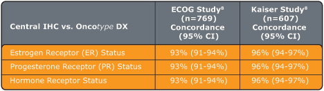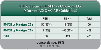 Η Συμφωνία του Oncotype DX με την Ανοσοϊστοχημεία και το FISH ξεπερνά τις απαιτήσεις των κατευθυντήριων οδηγιών του ASCO/CAP που απαιτούν 95% συμφωνία για τον καθορισμό της κατάστασης του HER2.