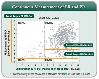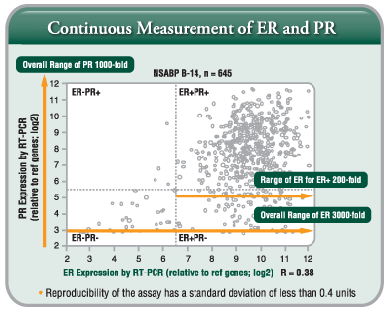 Τα επίπεδα των ER/PR είναι σημαντική στον καθορισμό της χορήγησης και στον υπολογισμό του οφέλους της επικουρικής ορμονοθεραπείας. Ο καρκίνος του μαστού εμφανίζει ένα ευρύ φάσμα έκφρασης ορμονικών υποδοχέων και η RT-PCR έχει την ικανότητα να αποτυπώσει με μεγάλη ακρίβεια αυτή τη συνεχόμενη μεταβλητή. Η RT-PCR μπορεί να μετρήσει το ER και το PR ως μια συνεχή διανομή γονιδιακής έκφρασης 3.000 φορές και 1.000 φορές μεγαλύτερο φάσμα για το ER και το PR αντίστοιχα.