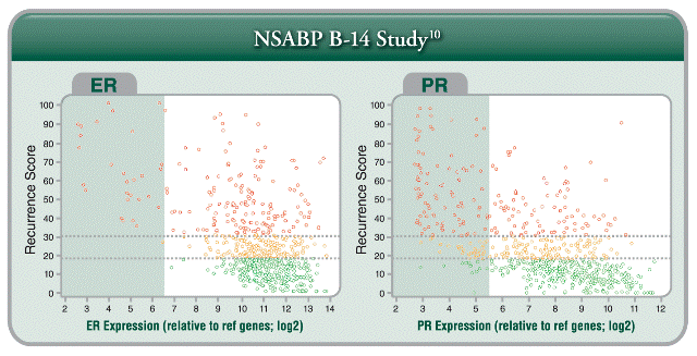 Το Oncotype DX αναλύει τα επίπεδα του ER και του PR (θετικό ή αρνητικό) μετρώντας την γονιδιακή έκφραση σε επίπεδο RNA. Υπάρχει μεγάλη συμφωνία μεταξύ του ER και του PR όπως καθορίζονται από το Oncotype DX και της ανοσοϊστοχημείας, η οποία δείχνει την έκφραση των γονιδίων ER και PR σε πρωτεϊνικό επίπεδο.