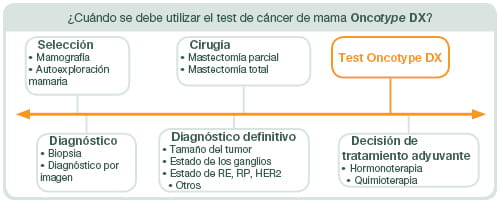El test Oncotype DX es un test diagnóstico molecular que analiza la biología individual de un tumor canceroso de mama, examinando la actividad de 21 genes en el tejido tumoral. Los resultados del análisis se vuelcan en una fórmula que calcula un resultado Recurrence Score®. El resultado Recurrence Score es un número entre 0 y 100 que aporta información acerca de la probabilidad de que el cáncer de mama reaparezca en los 10 años siguientes al diagnóstico y, lo que aún es más importante, la probabilidad de que se beneficie de la quimioterapia.