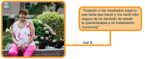 El test genera el resultado Recurrence Score®, un número entre 0 y 100. Las pacientes con resultados Recurrence Score más bajos tienen menor riesgo de reaparición del cáncer. También tendrán menos probabilidad de beneficiarse de la quimioterapia. Sin embargo, esto no significa que no exista ninguna posibilidad de reaparición del cáncer. Del mismo modo, un resultado Recurrence Score más alto significa que hay más probabilidades de reaparición del cáncer. Un resultado Recurrence Score más alto no significa que el cáncer vaya a reaparecer siempre. Estas pacientes tendrán mayor probabilidad de beneficiarse de la quimioterapia como parte de su tratamiento.