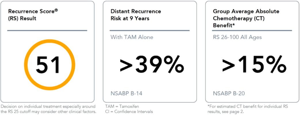 Disclaimer: These case studies are brought to you for educational purposes only and should not be interpreted as an endorsement of Exact Sciences or its services by the submitting physician. The information reflects the interpretive diagnostic opinions of the treating physicians and is not intended to represent a standard of care. The case studies describe real-life cases of patients who have been prescribed the Oncotype DX® test. They are not necessarily representative of all tested patients, and the result in any given case will vary. The examples are not necessarily representative of all of those who will use our clinical tests. Exact Sciences does not endorse any of the contributors featured on this site and takes no view as to the treatment decisions reported in these cases.